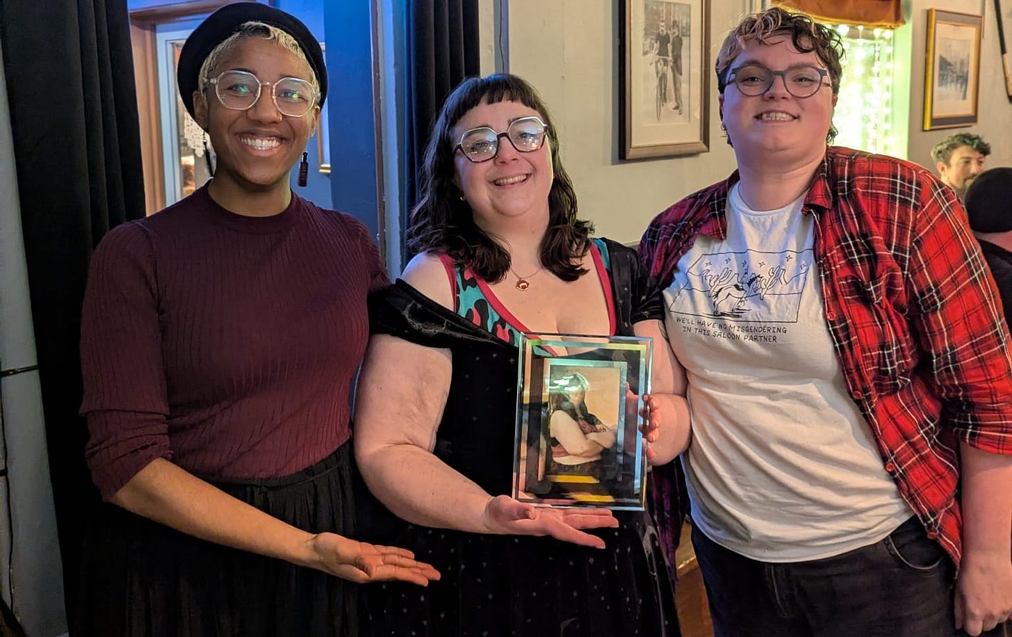 It was my birthday!! I continue to be thirty-something years old and to celebrate, I hosted a quiz about myself. This is me presenting the first-place prize to my pals: a portrait of me which is now in pride of place in their bathroom.